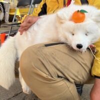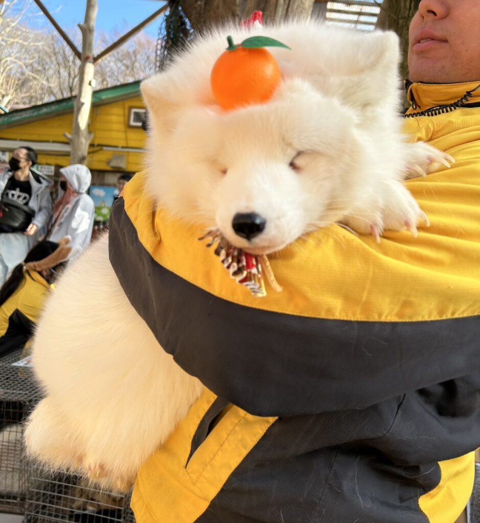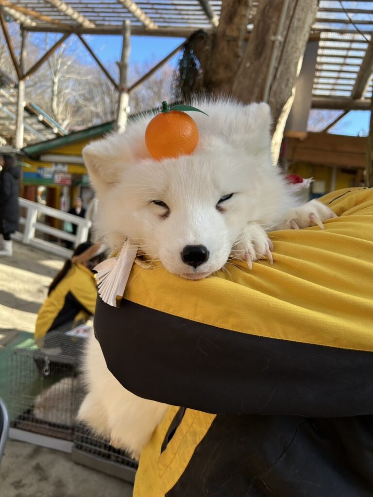 年明けのだっこ体験では、縁起のいいかがみ餅スタイルで、年ギツネのハナコちゃんが、お客様をお迎えしました。